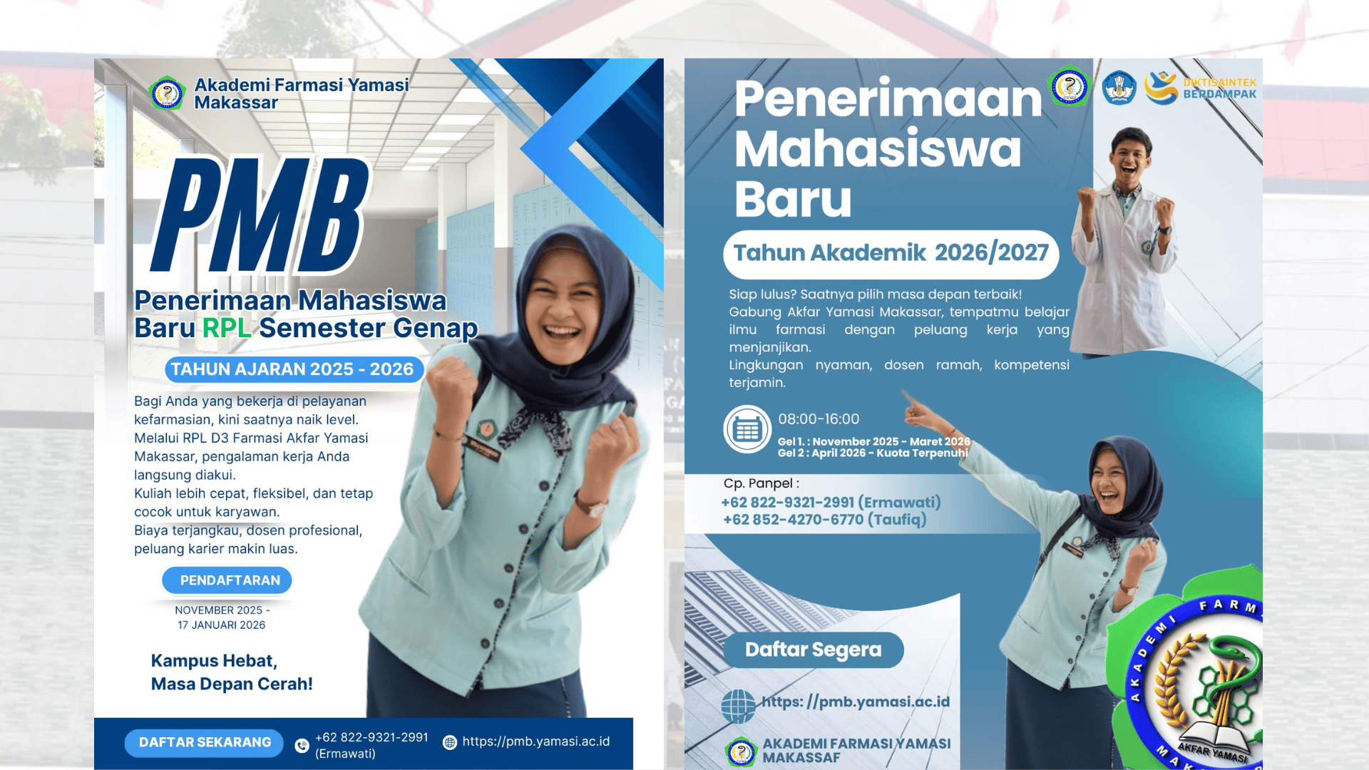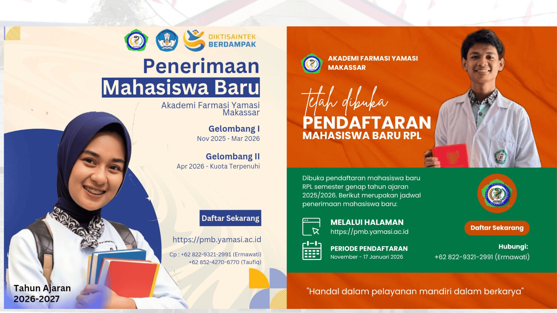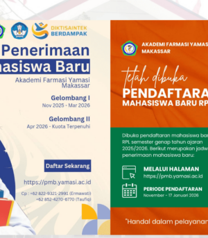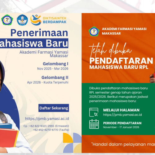 Akademi Farmasi Yamasi membuka pendaftaran mahasiswa baru JALUR RPL SEMESTER GENAP 2025/2026 dan JALUR REGULER TAHUN AKADEMIK 2026/2027. Mari bergabung bersama kami “Akademi Farmasi Yamasi Makassar” Program Studi Diploma III Farmasi, langsung aja klik https://pmb.yamasi.ac.id