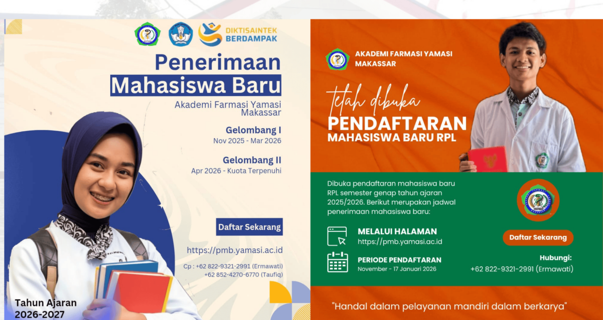 Akademi Farmasi Yamasi membuka pendaftaran mahasiswa baru JALUR RPL SEMESTER GENAP 2025/2026 dan JALUR REGULER TAHUN AKADEMIK 2026/2027. Mari bergabung bersama kami “Akademi Farmasi Yamasi Makassar” Program Studi Diploma III Farmasi,